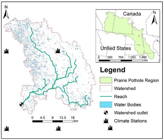 Hydrologic models have become an effective tool to explore the spatial and temporal variations of hydrologic processes, evaluate water quantity and quality, as well as provide valuable information for water resources management and planning [1,2,3,4]. However, it was found that traditional hydrologic models, where surface depressions are often removed to create a well-connected drainage system, tend to overestimate streamflow [5,6,7] and may not reproduce the spatial distribution of water yields [7] for depression-dominated watersheds. Therefore, incorporating the influences of depressions into hydrologic modeling is of significance for understanding depression-oriented hydrologic processes and estimating water resources of depression-dominated areas.