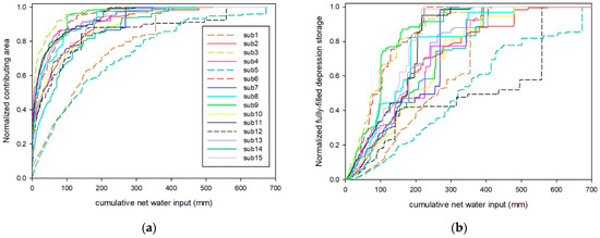 To explore the threshold-controlled overland flow dynamics, the intrinsic changing patterns of contributing area and fully-filled depression storage were determined (Figure 7). At the beginning of net water input, the normalized contributing areas represent the area percentages of CBUs of all subbasins (Figure 7a). Along with the application of net water input, the contributing areas of all subbasins follow a similar increasing pattern. That is, the contributing areas increase rapidly at the beginning of the depression filling, which is because there is a large number of PBUs with smaller MDS values in subbasins. With the increase in the cumulative net water input, the contributing areas exhibit stepwise changes due to the existence of PBUs that take a longer time to be fully filled and become subbasin-contributing areas. For different subbasins, contributing areas increase at different rates during depression-filling processes and the timing of occurrence of stepwise changes is also different (Figure 7a), which can be attributed to the characteristics (e.g., MDS) of the PBUs in each subbasin. For example, the contributing areas of subbasins 1 and 5 increase much more slowly than those of other subbasins, indicating that there are many depressions with larger MDS in subbasins 1 and 5 (Figure 6). Figure 7b shows the variations of the fully-filled depression storage of all subbasins during the depression-filling processes. The fully-filled depression storage of each subbasin starts from zero and then increases with the expansion of the subbasin-contributing area. The stepwise changes in Figure 7b also stem from the existence of depressions with larger MDS. The occurrence and timing of stepwise changes in the normalized fully-filled depression storage curve (Figure 7b) of a subbasin are the same as those in the corresponding normalized contributing areas (Figure 7a) due to the paired relationship between the contributing area and the fully-filled depression storage of the subbasin. The normalized fully-filled depression storage curves often exhibit large and sudden stepwise changes compared to the corresponding normalized contributing areas since the magnitudes of MDS of a PBU are much larger than its surface area.