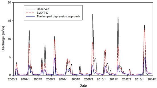 In the research reported in this paper, two modeling scenarios (MS1: SWAT-D; MS2: lumped depression approach) were performed to demonstrate the improvement of the SWAT-D and the importance of the research reported in this paper. Figure 8 and Figure 9 display the monthly and daily discharges at the watershed outlet simulated by using the lumped depression approach. From the comparison of the simulated outlet discharges for MS1 and MS2, it can be observed that the discharges at the watershed outlet were reasonably reproduced in MS1, while the lumped depression approach tended to underestimate the outlet discharges in MS2. The differences in the simulation results for the two scenarios can be attributed to the different representations of depressions (Figure 10). In MS2, all depressions within a subbasin were lumped together, and the lumped depression did not contribute any surface runoff until its threshold was reached. In reality, however, depressions with smaller MDS made runoff contributions at the early stage, while larger depressions were still at the filling condition. Thus, with the lumped depression representation, more rainfall excess was trapped in the depression, and surface runoff generated from the depressional area was underestimated. In MS1, instead of using a lumped depression, all individual depressions were considered, and their filling–spilling dynamics were tracked through the intrinsic changing patterns of the contributing area and depression storage (Figure 10). In such a configuration, the gradual water release from depressions and the threshold behavior of an overland flow can be simulated. Therefore, tracking the filling–spilling of depressions avoids underestimating the generated surface runoff and outlet discharges and endues the SWAT-D with the ability to mimic depression-influenced hydrologic processes.