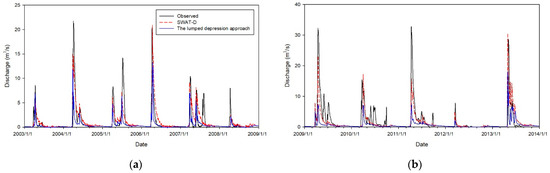 Figure 8 shows the simulated and observed monthly average flows at the watershed outlet for the calibration and validation periods. Overall, the SWAT-D can reproduce the depression-influenced catchment responses on both low flow and high flow conditions. Specifically, the distribution, timing, and duration of peak flows were reasonably characterized by the SWAT-D, and the magnitude of most peak flows simulated by the SWAT-D matched that of the observed ones. In addition to the peak discharges, the SWAT-D also provided reasonable volumes of discharges. For example, the simulated and observed volumes of discharges in 2004 were 4.93 × 107 m3 and 4.59 × 107 m3, respectively, (the deviation between the simulated and observed volumes of discharges in 2004 was only 7%). The peak discharges and the total volumes of discharges in some years (e.g., 2009 and 2011) were underestimated in the SWAT-D, which can be attributed to the model simplifications and the uncertainties in model parameters and input data. In addition to the monthly average flows, the simulated and observed daily discharges at the watershed outlet were also compared for the calibration and validation periods. As shown in Figure 9, the magnitude, duration, and timing of most peak flow simulated by the SWAT-D match those of the observed data. Several small peaks were not captured (e.g., in 2009 and 2010), due to the lack of sufficient data to represent the real spatial distribution of precipitation across the watershed. The good agreement between the SWAT-D simulations and the observed data demonstrated the ability of the SWAT-D to mimic the depression-oriented hydrologic processes.