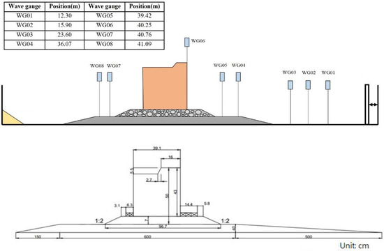 The time series of free-surface elevation was measured at eight locations at a sampling rate of 100 Hz to provide water wave propagation data. These sensors are denoted as WGx, where x = 1–8 indicates the gauge number. WG1–WG3 were used to measure the initial wave height, WG4 and WG5 were used to measure the wave heights in front of the caisson, WG6 was located at the front face of the caisson and was used to measure the height of the overtopping wave, and WG7 and WG8 were used to measure the local wave heights at the rear face. The dynamic wave pressures were measured using 22 tiny pressure transducers on the vertical structure at the front (Pf1–Pf9), rear (Pb1–Pb8), and bottom (Pbo1–Pbo5) faces of the caisson. Table 2 lists the positions of the pressure gauges shown in Figure 2. The sampling frequency of the wave pressure transducers was 100 Hz.