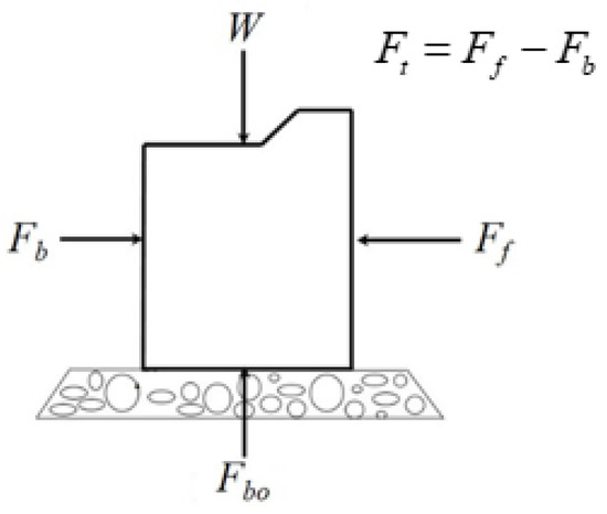 The obtained forces were defined as (1) horizontal force on front face, (seaward) (2) horizontal force on the back side, (backward); (3) (bottom) is the vertical force on the bottom. The total force () acting on the caisson is calculated as the sum of and shown in Figure 3. The wave-induced horizontal forces on the front and rear walls were obtained from integrating the experimental wave pressure distributions along the front and rear walls of a caisson breakwater, and the uplift forces were calculated by integrating the pressure below the caisson.