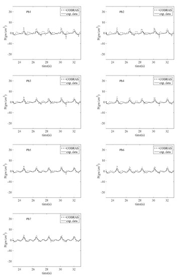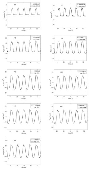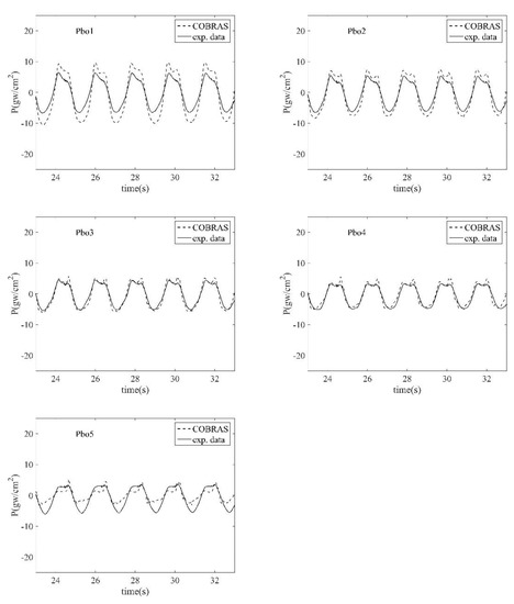 Figure 5, Figure 6 and Figure 7 present a comparison of the simulated and measured time series of dynamic pressure at the front, rear and bottom faces of the caisson for a regular wave (wave height H = 22 cm, wave period T = 1.94 s). The readings from nine pressure transducers at the seaward face (Pf1–Pf9), seven pressure transducers at the landward face (Pb1–Pb7) and five pressure transducers below the caisson (Pbo1–Pbo5) were compared. The dashed line represents the numerical simulation, and the solid line represents the experimental measurements. In general, the model makes accurate predictions of the dynamic wave pressure at the front face of the caisson. However, it overestimated the dynamic wave pressure at the rear and bottom faces at the average errors of approximately 10% and 20%, respectively. This was caused by the difference in the formation of the overtopping wave jet and the porous medium below the caisson. The COBRAS model overestimated pressure spikes at certain locations where an overtopping wave jet and high aeration region were expected.