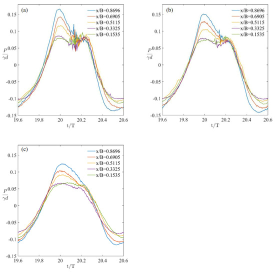 Interestingly, the bottom wave pressure had a double-peak distribution at some dimensionless locations (x/B), as shown in Figure 8, under three wave steepness conditions (H/L = 0.0383, 0.0425, and 0.0468), where x is the pressure gauge location with the original point located at the rear side of the caisson. B is the bottom width of the caisson. The wave steepness was positively associated with bottom wave pressure. When the wave steepness increased, the double-peak distribution of the bottom wave pressure became more obvious.