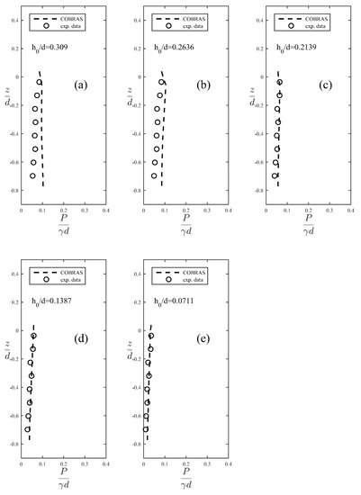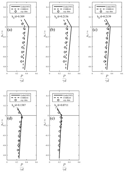 The comparison of maximum wave pressure along the seaward (front) face of caisson as obtained from experiments, numerical simulations, and Goda’s formula [26] for various dimensionless overtopping heights (h0/d). (a) h0/d = 0.309; (b) h0/d = 0.2136; (c) h0/d = 0.2139; (d) h0/d = 0.1387; (e) h0/d = 0.0711.
