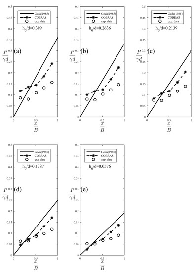 The comparison of maximum wave pressure along the bottom face of caisson as obtained from experiments, numerical simulations, and Goda’s formula [26] for various dimensionless overtopping heights (h0/d). (a) h0/d = 0.309; (b) h0/d = 0.2636; (c) h0/d = 0.2139; (d) h0/d = 0.1387; (e) h0/d = 0.0576.