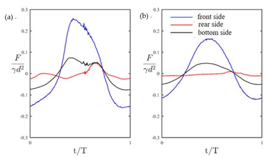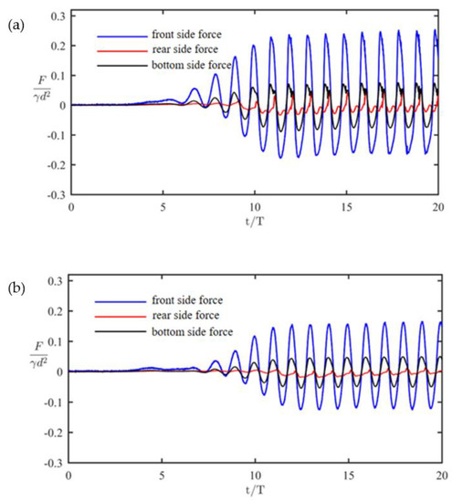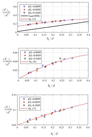 Equations (5)–(7) are plotted in Figure 14a–c, respectively, and are compared with the empirical formula given by [32]. Notably, [32] only considered the horizontal force at the seaward face. The comparison indicated that the formula given by [32] underestimated the experimental data.