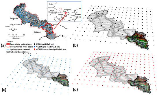 Illustration of (a) the Mesta/Nestos transboundary river basin and of the case study watersheds (red polygon), and of (b) the ERA5 grid (black dots) of 9 × 9 km resolution, (c) the CCLM grid of 12.5 × 12.5 km resolution (blue dots), and (d) the CCLM spatio-temporal interpolated grid (red dots) of 9 × 9 km resolution overlaying the hydrological model’s grid of the basin and of the case study area (represented by a 3D elevation model overlayed by the model’s grid).