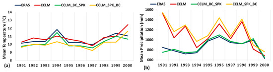 The classification of the best method—i.e., CCLM_BC_SPK or CCLM_SPK_BC—is also established by the precipitation density plots, Figure 4b, where it is clearly depicted that the mean annual CCLM_BC_SPK curve fits better the distribution of ERA5, than the curve of CCLM_SPK_BC. In particular, the daily CCLM_BC_SPK and ERA5 precipitation differences are minimized for the period from 1991 to 2000 over the research area, while in the case of the CCLM and CCLM_SPK_BC an important overestimation of the precipitation is observed.