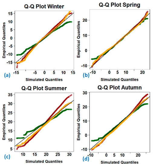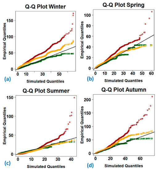 The precipitation’s seasonal Q-Q plots, i.e., the quantiles plots of the reference dataset (ERA5) against the quantiles of the other datasets (CCLM, CCLM_BC_SPK, and CCLM_SPK_BC), for the period of 1991 to 2000 are depicted in Figure 3. Comparing the ERA5 and CCLM precipitations, significant differences appear between the two datasets during all seasons, as the CCLM precipitation (red curves in Figure 3) diverges from the ERA5 one (black diagonal line in Figure 3). The greater deviations are detected during the winter (Figure 3a) and autumn (Figure 3d) periods, meaning that the CCLM’s simulated precipitation overestimated the respect ERA5′s precipitation. This overestimation is lower during the spring (Figure 3b) and summer (Figure 3c) periods.