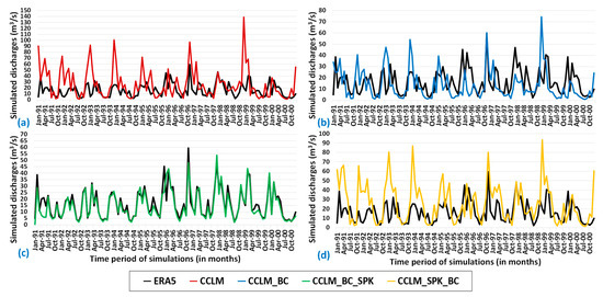 Simulated runoff when the model is triggered by the ERA5 datasets (black curves) versus the runoff of (a) CCLM (red curve), (b) CCLM_BC (blue curve), (c) CCLM_BC_SPK (green curve), and (d) CCLM_SPK_BC (orange curve) forcings of the hydrological model.