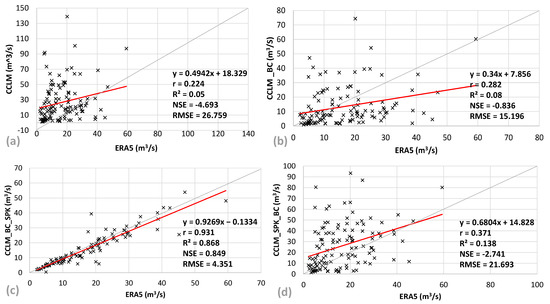 The simulation outputs when the hydrological model is forced by the ERA5 dataset demonstrate that the mean and maximum monthly river’s discharges (n = 120 months) at the basin’s outlet are 16.28 m3/s and 59.38 m3/s respectively, Figure 6. In case of forcing by the CCLM dataset, the mean river’s runoff equals 26.38 m3/s, i.e., 38.28% more than the reference runoff, and the maximum runoff equals 138.86 m3/s, i.e., 57.24% more than the reference one, Figure 6a. The hydrological model triggered by the bias corrected climate model dataset, i.e., the CCLM_BC dataset, shows that the mean and maximum runoff equal 13.39 m3/s (21.58% less than the reference one) and 74.34 m3/s (20.12% more than the reference maximum discharges) respectively, Figure 6b. When the climate model’s biased corrected and spatiotemporally interpolated data—i.e., the CCLM_BC_SPK data—are used, the mean intermontly discharges are 14.96 m3/s (8.8% less than the reference runoff) while the maximum equals 53.84 m3/s (10.2% less than the reference maximum), Figure 6c. Finally, when the forcing of the hydrological model is conducted by the climate model’s spatiotemporally interpolated and bias corrected dataset, i.e., the CCLM_SPK_BC dataset, the mean discharges are 25.90 m3/s (37.14% more than the reference ones) and the maximum discharges are 93.39 m3/s (36.41% more than the reference maximum), Figure 6d.