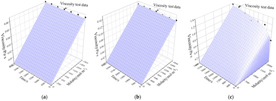 Three cement grouts are prepared with distinct water–cement ratios 1.0, 0.8, and 0.6 and corresponding densities 1485 kg/m3, 1530 kg/m3, and 1630 kg/m3, respectively; the molarities of tricalcium silicate were calculated to be 1628 mol/m3, 1864 mol/m3, and 2234 mol/m3, respectively (calculated according to the proportion of tricalcium silicate is 50%). An NDJ-5T rotational viscosimeter was adopted to test the time-varying data of viscosity, and the linear interpolation algorithm [36] is adopted to drive the 3D surface functions of grouting material viscosity versus time and molarity: