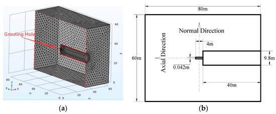 As shown in Figure 3, the model size is 60 m × 80 m × 60 m, the tunnel diameter is 9.8 m, it is tunneled for 40 m, the grouting borehole diameter is 4.2 cm, and borehole’s length is 4 m. The calculation process falls into initial ground stress balancing, tunneling, and borehole grouting.