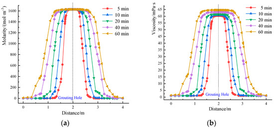 With the calculation model at a water–cement ratio of 1.0, initial permeability 5D, and grouting pressure 2 MPa as an example, a 10 meter-long monitoring line is set in the direction perpendicular to the grouting holes to analyze the cement grouting migration law. The grouting radius of grouting materials and the range of transition region at different times are calculated as shown in Figure 4. There exists a certain transition region between grouting materials and underground water. Meanwhile, since viscosity and permeability coefficient are both dependent variables on molarity, 10% of the initial molarity (162.8 mol/m3) of grouting materials can be taken as an indicator of permeation radius of grouting materials; 10%–95% of the initial molarity (162.8–1546.6 mol/m3) of grouting materials is defined as the transition region; and 95%–100% of the initial molarity as the raw slurry region.