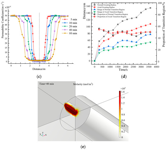 Figure 4. Basic law of grouting migration (initial permeability 5D, grouting pressure 2 MPa, and water–cement ratio 1.0). Panel (a) displays the molarity distribution characteristics of grouting materials at different times; (b) displays the viscosity distribution characteristics of grouting materials at different times; (c) displays the permeability coefficient distribution characteristics of grouting materials at different times; (d) displays the grouting radius and range of transition region of grouting materials at different times; (e) displays the molarity contour surface of grouting material migration for 40 min.