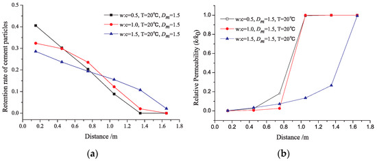 Figure 5. Law from the indoor simulation test by Du, X. [42]. Panel (a) displays the variation of retention rate of cement particles with migration distance at distinct water–cement ratios; (b) displays the variation of permeability with migration distance at distinct water–cement ratios.