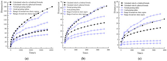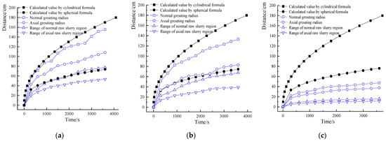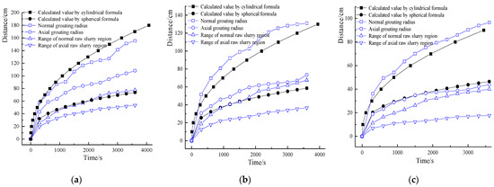 Figure 6. Comparison between numerically simulated values and theoretically calculated values of grouting radius at distinct water–cement ratios; (a) w:c = 1.0; (b) w:c = 0.8; (c) w:c = 0.6.