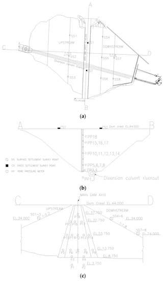 The measuring instruments of the dam to be studied were installed for stability and behavior analysis during construction, after completion, and impoundment, and they detect stability and behavior of the dam through the analysis of measured data. Their purpose is to be utilized for operation and maintenance of the dam for long-term use. In general, in the case of the fill dam, various instruments such as porewater pressure meter, earth pressure gauge, inclinometer, and differential settlement gauge are installed. In the case of the porewater pressure meter subject to this study, a total of 18 locations are installed in the base, core, and filter sections of the dam, as shown in Figure 2, in order to determine the appropriateness of the penetration outflow through the variation of the water pressure after impoundment. Measured data were automatically measured from 1 June 2009 after impoundment, and this study analyzed measurement data for around 10 years until 10 June 2019.
