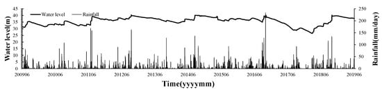 Figure 3 shows changes in water level and rainfall over time in the dam subject to the study. The missing rate of the water level during the data collection period was 0%, indicating that the data are well managed. As shown in Figure 3, it can be seen that the water level rises when rainfall increases rapidly, and that it is operated and managed within the normal high-water level (EL.40 m). The average of the water level gauge was 35.68 m, and its standard deviation was 2.97 m, while the average rainfall was 3.27 mm (std 12.13 mm), and the maximum rainfall was 234 mm.