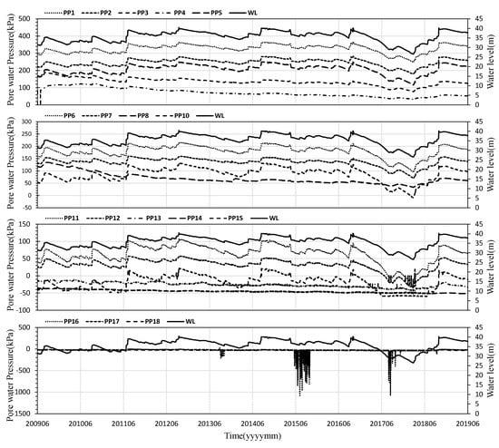 The measurement results from 1 June 2009 to 10 June 2019 were analyzed. The average missing rate of the porewater pressure meter during the data collection period was 7.5%, and the missing frequency for each point was similar. The pore pressure meter point PP09 was excluded from the analysis as it became inoperable after completion. Figure 4 are representations of the water level and the porewater pressure at point PP01–PP18. Each analysis result can be represented by Table 1. It shows that the water pressure is high at PP01 and PP02, which are located at the bottom, affected by the seepage line formed inside the dam’s body. Located in the core part of the dam, PP12 showed relatively low water pressure, which indicates that PP12 may be at the boundary of the seepage line. In the case of PP04 and PP08 installed on the downstream side of the dam’s core part, it can be seen that relatively large values work in the early stages of impoundment and become smaller over time. It may be determined that the water pressure worked as the seepage line was formed during the early impoundment and the water pressure became lower as the dam became stabilized. PP13 and PP14 are determined to be located at the upper part of the seepage line, measured to have negative porewater pressure with averages of −26 kPa and −45 kPa, respectively. In the case of PP16 to PP18 installed at the top of the upper side of the dam, it was shown that the negative (−) porewater pressure mainly worked. It is installed near the water level and is considered to be the negative (−) porewater pressure caused by the unsaturated ground when the low water level becomes lower.