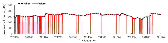 Figure 5 shows the raw data of PP01 and the time series data after linear interpolation. The average missing rate was 7.5%. The missing point showed a downward curve with a value of 0, as shown in the figure, with the measurement recorded as “0”. As shown in the figure, according to the time series distribution of the porewater pressure meter, it was determined that unusual behaviors such as severe vertical vibration or large amount of outliers occurring locally were not observed in the time series distribution, and therefore linear interpolation using Spline was conducted. In other words, linear interpolation was conducted for missing sections by generating Spline, connecting local peaks extracted from inflection point analysis and synthesizing the extracted raw data and the generated Spline.