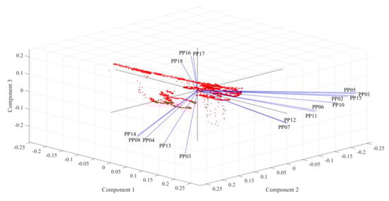 In this study, principal component analysis was performed to determine the appropriate group on the basis of the statistical similarity of the porewater pressure meters installed in the dam body under study. Although the criteria for how many principal components to be adopted have not been theoretically determined, the porewater pressure meter was summarized in three principal components by applying the generally applied grouping criteria (Lee, 2012 [17]): (1) 1 or higher correlation matrix eigenvalue (latent), (2) cumulative proportion of more than 70~80%. Figure 6 represents the component chart according to the three selected principal components (Table 2). The results of the group classification of the porewater pressure meter performed from the component score coefficient matrix results are shown in Table 3. According to the component scores in Table 3, PP01, PP02, PP03, PP05, PP06, PP07, PP10, PP11, PP12, and PP15 were classified as Group A; PP04, PP08, PP13, and PP14 as Group B; and PP16, PP17, and PP18 as Group C.