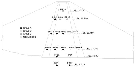 Figure 7 shows the location of three group-specific porewater pressure meters classified on the basis of principal component analysis. As shown in the figure, the porewater pressure meters classified as Group A were located primarily in the upper/lower part of the upstream dam, whereas those classified as Group B were mainly distributed in the downstream part/intermediate part of the dam, and those classified as group C were mainly distributed in the upper part of the upstream dam. They were classified as internal, external, and upper on the basis of the seepage line formed within the dam body.