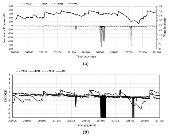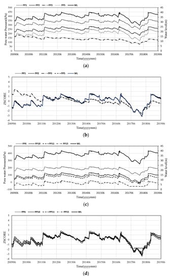 For PP03, the porewater pressure over time tended to be similar to water level, as shown in Figure 8a. However, as shown in Figure 8b, the z-score of PP03 was relatively large at the beginning after its completion and relatively small after about 2014, and therefore it was determined that the reliability of the instrument was degraded. That is, it was classified as Group A by the principal component analysis, but as shown in Table 4, the correlation coefficients between the instruments and the water levels in the group were 0.40~0.78 and 0.38, respectively, and was excluded from the regression analysis of following section.