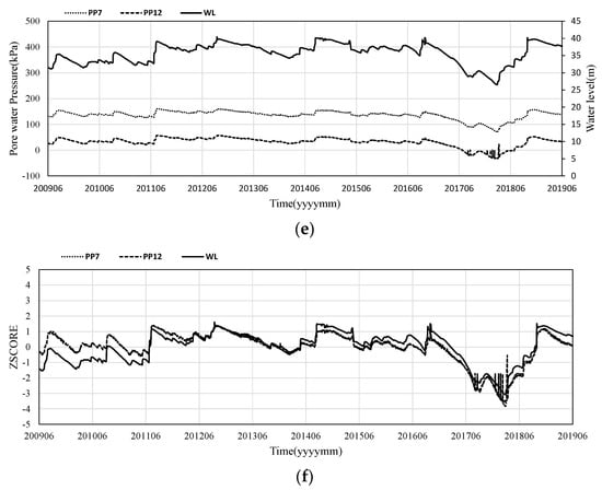 Relationships between water level and porewater pressure for group A: (a) comparisons with water level and Group A-a; (b) z-score for group A-a with water level; (c) comparisons with water level and Group A-b; (d) z-score for group A-b with water level; (e) comparisons with water level and Group A-c; (f) z-score for group A-c with water level.