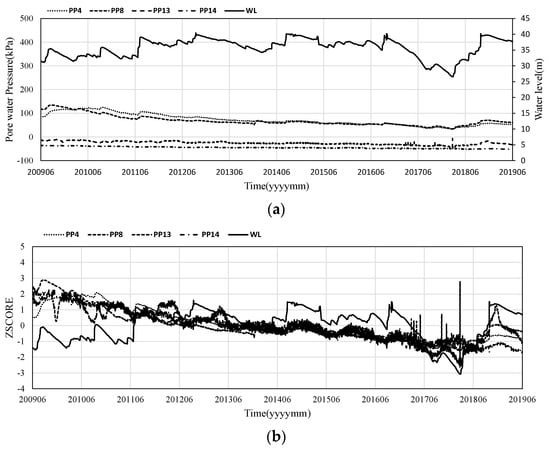 Relationships between water level and porewater pressure for Group C: (a) comparisons with water level and Group C; (b) z-score for Group C with water level.