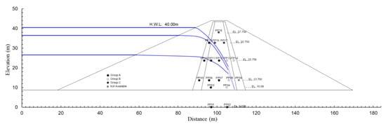 Figure 8 shows a comparison of the measured porewater pressure and water level for each group. As shown in Figure 8a,c,e, the size of the porewater pressure in Group A varied depending on the location of the installation, but it tended to be similar to the water level. In other words, the trend of water level was consistent with the porewater pressure, represented in the z-score distribution chart of Group A shown in Figure 8b,d,f. This indicates that Group A had a very high correlation with water level as well as with the correlation between instruments in the group, as mentioned above. On the other hand, as shown in Figure 9 and Figure 10, Group B and Group C did not show much of a correlation with water levels. Figure 11 shows changes in the seepage line of the dam prepared from the measurement results of the porewater pressure installed in the dam following the changes in water level. As shown in Figure 11, Group A-a existed inside the line, and Group A-b was included inside the line when the water level was 37.75 m. If the water level was relatively low at EL. 26.55 m, PP11 and PP12 would be outside the boundary of the seepage line, and therefore the porewater pressure would not normally be measured, whereas PP11 and PP12 would be included inside the seepage line in a normal high water level of EL.40 m. In other words, it is believed that the porewater pressure is related to the path of the seepage line caused by changes in water level.
