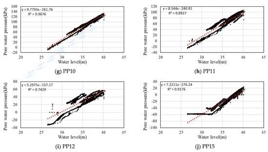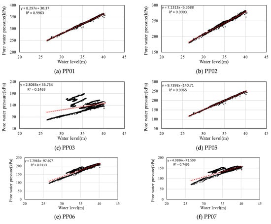 Since the porewater pressure in Group A showed high coefficient of correlation with water level, we propose a model that can predict the porewater pressure according to the changes in water level by conducting a regression analysis on water level and porewater pressure meter. The regression analysis was performed for the case where the water level was set as an explanatory variable, and each porewater pressure was set as a response variable. Table 5 summarizes the results of the development of the primary linear regression model with the porewater pressure meter and water level. Figure 12 illustrates the results of the development of the primary linear regression model, showing only the results for the highly correlated Group A. As shown in Figure 12a,b,d, PP01, PP02, and PP05 were classified as Group A-a with an R2 of 0.99 or more, drawing on highly related relation formula. The R2 of Group A-b was 0.8927 to 0.9676, indicating relatively high correlation. On the other hand, the R2 of Group A-c was 0.7495 to 0.7429, indicating a relatively low correlation with the water level among Group A, but the group showed a stable distribution of each measured value around the developed regression line. For Groups B and C, the R2 was distributed from 0.001 to 0.0497, and 0.0187 to 0.0331, respectively, indicating no correlation with water level. As summarized in Table 5, the determination coefficients of the primary linear regression model with the porewater pressure meter and water level were analyzed to satisfy the appropriate explanatory power for Group A only, and the porewater pressure was determined to be predictable with changes in the water level. In other words, it is possible to predict porewater pressure when the water level is fixed as an explanatory variable and to determine the safety of the dam by comparing it with the currently measured value. In addition, an appropriateness test was conducted through an F-test that was performed for each regression model developed, which was also analyzed to satisfy statistical goodness of fit in Group A, aside from Group B and Group C. In addition, the variability of the measured value tended to increase as the installation position of the porewater pressure meter became higher due to the effect of the water level. It is determined that changes in the seepage line of the dam body due to the fluctuation of the water level have a significant impact on the measured value.