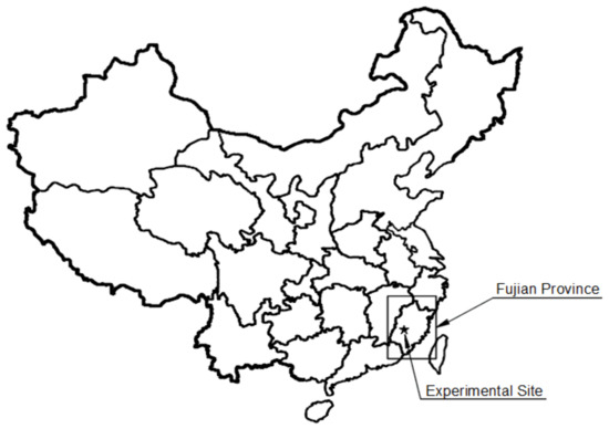 The experiment was conducted from 15 September to 30 December in 2020 at Fruit Science Demonstration Base of the Old Liberated Area (Figure 1) in Yunxiao County, Fujian Province, China. The annual average temperature in Yunxiao County is 21.3 °C. In the past ten years, the extremely maximum temperature was 38.1 °C, and the extreme minimum temperature was −0.2 °C. The annual precipitation is 1730.6 mm, and the frost-free duration is 347 days. The county has a subtropical marine monsoon climate. In the experimental year, the average temperature from September to December was 33, 31, 28 and 25 °C, respectively, and the rainfall was 165, 55, 36 and 30 mm, respectively. The soil type in the experimental site was red soil, according to the Chinese Soil Taxonomy. The physical and chemical properties of the soil in the plough layer were as follows: pH (pHw) of 5.9, available N (using the alkali hydrolysis nitrogen diffusion method) of 90.2 mg kg−1, available P (using the Olsen method) of 12.2 mg kg−1, available K (using the flame photometer method) of 152.3 mg kg−1, bulk density (using the ring knife method) of 1.26 g cm−3 and field water capacity (using the ring knife method) of 29.8%.