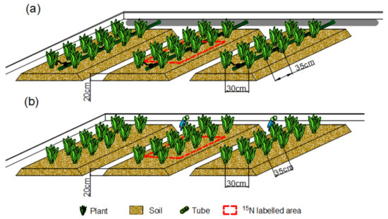 Experimental block and micro-block (15N labeled area) ((a) the drip irrigation block and (b) the furrow irrigation block).