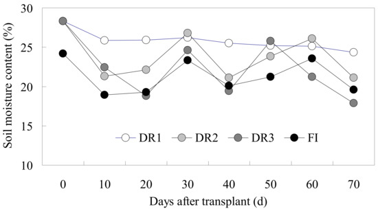 The soil moisture in the plough layer showed a fluctuating regularity (Figure 3) under the different irrigation modes. The soil moisture under DR1 varied slightly and was at a high level of 24.3–28.3%. The soil moisture under DR2 during the whole growth period of lettuce was generally lower than that under DR1, except for some individual time points such as 30 and 60 days after transplanting, which was mainly due to the fact that the DR2 treatment conducted the irrigation exactly before these two time points. Similarly, the soil moisture under DR3 was lower than under DR2. It was worth noting that the average soil moisture under FI was 10.78% lower than under DR2, although the irrigation regimes of FI and DR2 were the same. This might be due to the furrow depth of 20 cm; FI firstly infiltrated the soil at a depth of 13–20 cm, according to the irrigation quota, and the wetting of the 0–13-cm soil layer needed to rely on the affection of the soil capillary. However, the soil moisture formed by the soil capillary under the FI treatment was lower than that directly dripped from the ridge surface under the DR2 treatment.