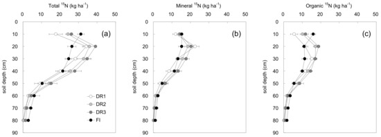 The relatively low total 15N amount but highest mineral 15Nin the 20-cm soil layer observed under DR1 (Figure 3) indicated that the wetter soil under DR1 (Figure 2) was more conducive to the mineralization of 15N in the plough layer. This conclusion was in-line with Miller’s [20] result that a 2-week dry–wet alternation significantly increased the amount of soil N mineralization compared to a 4-week dry–wet alternation. It was suggested that, in practice, irrigation with a smaller quota but higher frequency was more conducive to soil N mineralization. On the contrary, the experiment by Franzluebbers [21] proved that the amount of soil mineral N measured after 3–6 weeks of air drying was two to five times higher than that during wetting. This illustrated that the earlier researcher sobtained different conclusions on the effect of the moisture condition on N mineralization. The reason responsible for the difference might be that soil N mineralization was affected not only by soil moisture but by various other factors, such as soil temperature and pH, as well as the determination time.