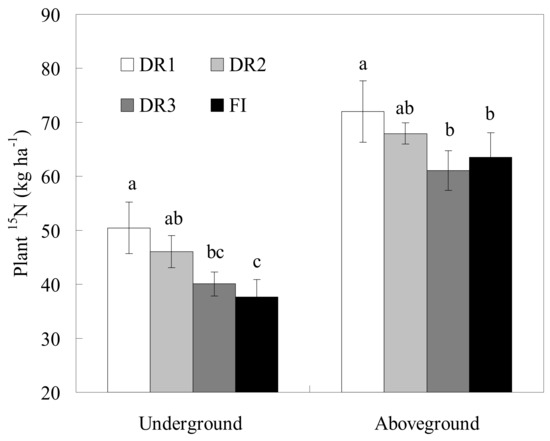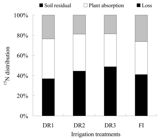 Compared with DR2, FI significantly (p < 0.05) increased the 15N loss by 23.0 kg ha−1. However, there was no significant (p > 0.05) difference in the soil residual 15N or plant 15N between FI and DR2.