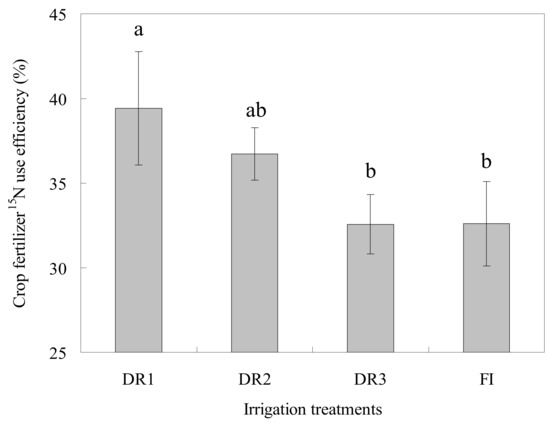 Effects of different irrigation modes on the 15N use efficiency of lettuce (DR1, DR2 and DR3 represent lower irrigation limits of 75%, 65% and 55% of the field capacity, respectively. FI is the furrow irrigation treatment with the same irrigation regime as DR2. The data in the figure are the mean ± SD. Different letters (a and b) indicate significant differences at the level of 0.05, according to Duncan’s multiple range test).