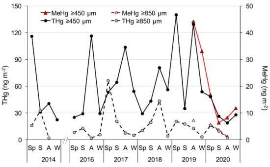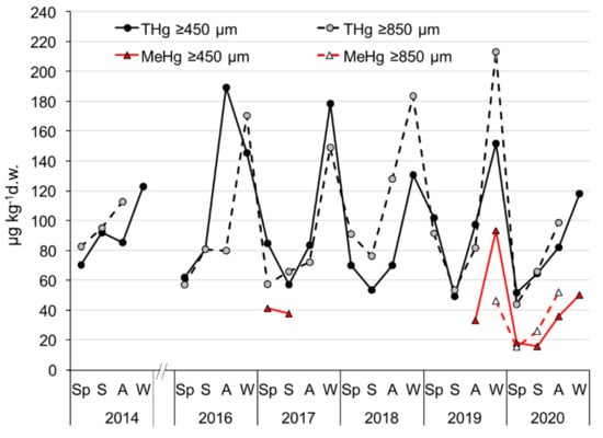 A marked seasonality characterized mercury concentration in both zooplankton size fractions. Generally, for THg, peak values were observed in winter (mean of 179 ± 27 µg kg−1 d.w. in ≥850 µm size fraction and 141 ± 22 µg kg−1 d.w. in ≥450 µm size fraction) and the lowest ones in summer (mean of 71 ± 20 µg kg−1 d.w. and 66 ± 17 µg kg−1 d.w. in the two size fractions, respectively), as for other contaminants [28,47] (Figure 2). The same trend was observed for MeHg (Figure 2).