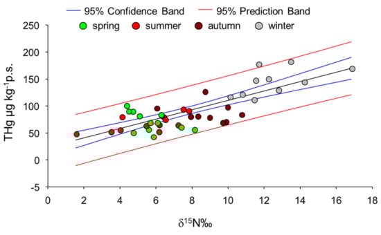 Seasonal trend of δ15N‰ signature supported higher Hg concentrations in winter. In fact, δ15N showed higher values in the winter period and lower ones during summer, while intermediate values characterized both spring and autumn. As expected, nitrogen isotopic signature (δ15N‰ range = 1.55 ‰–16.84 ‰) was positively correlated with mercury concentrations (Pearson’s correlation; for THg, r = 0.79, N = 44, p < 0.001; for MeHg, r = 0.93, N = 10, p < 0.001), since mercury levels are linked to trophic position [1,21] (Figure 3).