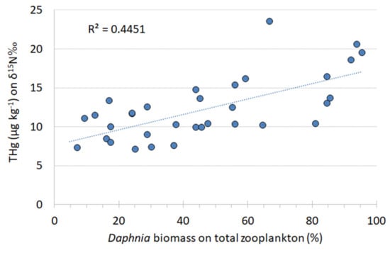 Δ15N signatures were basically the same in both size fractions (Figure S2), and this may explain why mercury values were generally similar between size fractions. Only in some cases, mercury values were higher in the ≥850 µm size fraction than in the corresponding ≥450 µm fraction (e.g., in winter 2018 and 2019 for THg, Figure 2). However, δ15N signatures did not emphasize a higher trophic level for the former group (Figure S2). Therefore, macrozooplankton was not proven to derive Hg from the ingestion of smaller zooplankton (i.e., from biomagnification), as reported in other case studies [5,22]. In those sampling dates, D. longispina-galeata gr. biomass dominated the ≥850 µm size fraction, while it was less relevant in the ≥450 µm size fraction. This may explain the observed differences in Hg concentrations. In fact, Daphnia species, even if primary consumers, proved to accumulate mercury more efficiently than other species and to be often dominant in the zooplankton community [10,25,31]. In some cases, mercury concentrations in zooplankton proved to be correlated with Daphnia biomass, which may drive mercury trends in the whole zooplankton community [9,10]. Additionally, the seasonal changes in δ15N‰ signature in bulk zooplankton may result not only from different abundancies of predator taxa, but also from different nitrogen resources available for Daphnia in different seasons. In summer, a prevalence of phytoplankton in particulate organic matter may lead Daphnia to lower δ15N‰ values, while in winter trophic resources could also be composed of bacteria, protozoa and detrital particles such as exuviae, which are more enriched in 15N isotope [28,36]. Moreover, Todorova et al. [9] showed that MeHg concentration in Daphnia increases with body size. In the case of Lake Maggiore, the maximum body length (and the maximum clutch size) of D. longispina-galeata gr. is reached in winter–early spring, when the highest mercury concentrations are observed. Figure 4 shows the relationship between the percent of D. longispina-galeata gr. biomass relative to the total zooplankton biomass and THg concentrations in zooplankton normalized to δ15N. As a result, Daphnia biomass can be used as a good predictor of mercury concentrations in zooplankton (R2 = 0.45, p < 0.01) by excluding summer values. In summer, the relationship was not clear and often inverse, and other mechanisms seem to drive mercury concentrations in zooplankton, such as bio-dilution, as discussed above.
