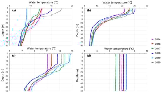 Vertical profiles of water temperature of the upper 50 m in Lake Maggiore during different seasons of the investigated years (2014 and 2016–2020): (a) spring; (b) summer; (c) autumn; (d) winter.