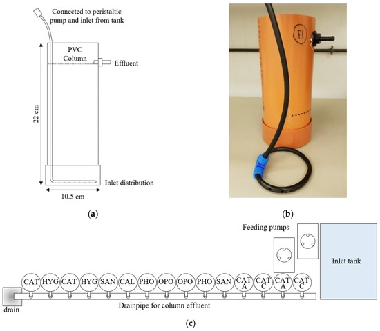 Column setup: (a) schematic overview of a single column set-up, (b) illustration of columns with inlet hose and inlet distribution, and (c) overview of the column setup.