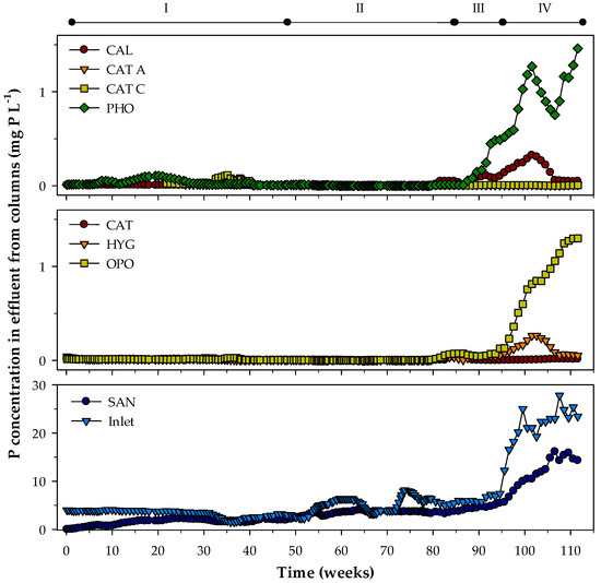 Initially, all columns removed P effectively, as the P concentration measured in the column effluent was low (Figure 2). However, after seven weeks of operation, an increase in outlet P concentration was detected for SAN with effluent concentrations above 1 mg P L−1. The increase in effluent P concentration continued during the following weeks and reached 14.3 mg P L−1 after 111 weeks (Figure 2; Table 2). Likewise, after 80–90 weeks of operation, the columns with OPO and PHO also showed consistent increases in outlet P concentrations (Figure 2). The increase in effluent P concentration for PHO and OPO continued until the end of the experiment and reached effluent P concentrations of 1.3–1.5 mg L−1 (Table 2). Only minor increases in outlet P concentration were observed for CAL and HYG from week 80 to week 111 (Figure 2). The effluent reached a P concentration of 0.05 mg P L−1 for HYG and OPO after two years of operation (Table 2). The remaining materials (CAT, CAT A, and CAT C) had very low effluent P concentrations in the complete operation period and showed consistent P removal, only reaching a P concentration of 0.01 mg P L−1 after the two years of operation (Figure 2; Table 2). Unfortunately, we had to terminate the experiment after two years of operation (before the columns were completely P saturated) due to resource and time constrains. Hence, we did not reach the point measuring similar P concentrations in effluent and inlet, and we could therefore not determine the columns materials total P removal capacity.