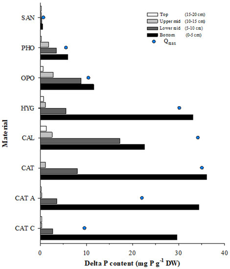 Figure 3 also shows the Qmax measured by fitting a non-linear Langmuir model in a previous experiment. Several of the materials (CAT, OPO, PHO, and SAN) had P contents in the bottom fraction that matched well when compared with Qmax, hence, indicating a good agreement between the potential P sorption in the batch and the P sorption measured in the column experiment (Figure 3). CAT had a bottom fraction with a P content of 36.1 mg P g−1 DM (the highest P content measured for all columns), which match well when compared with the measured Qmax of 35.1 mg P g−1 DM. Likewise, the bottom fraction P contents for OPO, PHO, and SAN were similar to the measured Qmax values (Figure 3). More specifically, the bottom fraction contained 0.8, 5.9, and 11.6 mg P g−1 DM for SAN, PHO, and OPO, respectively, while the Qmax values were determined to 0.7, 5.6, and 10.5 mg P g−1 DW, mentioned in the same order. In comparison, we observed a poor compliance for CAL between the Qmax and the P content in the bottom fraction, as the Qmax was measured to 34.2 mg P g−1 DM and the bottom fraction only contained 22.6 mg P g−1 DM. This indicated that Qmax in the short-term experiment predicted too high a P sorption potential for CAL. The opposite was the case for HYG, CAT A, and CAT C, as more P accumulated in the bottom fraction compared to the reported Qmax values. More specifically, the P content in the bottom fraction was measured to 29.7, 33.2, and 34.4 mg P g−1 DM for CAT C, HYG, and CAT A, respectively, while Qmax only were reported to 9.6, 30.2, and 22.1 mg P g−1 DM (Figure 3). These results showed that for some materials there was not a direct connection between Qmax determined in the batch experiments and the P sorption measured for the materials in the column experiment.