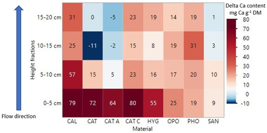 Delta Ca content in four height fractions. The delta Ca content (mg Ca g−1 DM) is the Ca content measured in the fractions after termination subtracted the initial measured Ca content (in the original material). A positive delta Ca indicates an accumulation of Ca while a negative delta Ca indicate a loss of Ca. The four fractions are; top (15–20 cm), upper-mid (10–15 cm), lower-mid (5–10 cm), and bottom (0–5 cm). Columns were up-flow fed (indicated by blue arrow). Each square in the heatmap show an average (n = 2) except for CAL (n = 1).