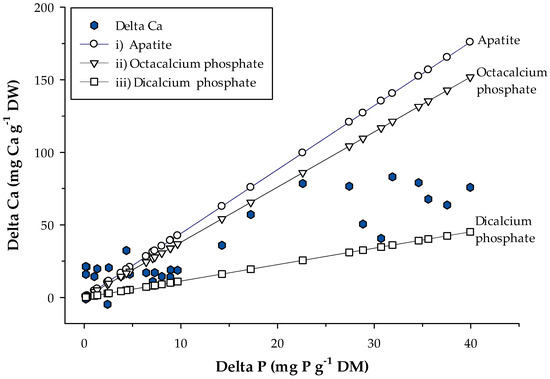 Additionally, higher contents of P were measured in layers with higher Ca content, which was especially evident for the bottom fractions of CAL, CAT, CAT A, CAT C, and HYG (Figure 3 and Figure 4). To assess this overlap, the relation between the delta P content and the delta Ca content were plotted (Figure 5). The figure only shows the distribution for the bottom and the lower-mid fractions, as these are the layers of interest with both Ca and P accumulation. Furthermore, to elucidate to which of the calcium-phosphate precipitates this could have occurred, three calculated scenarios were included: (i) Apatite (Ca5(PO4)3OH), (ii) Octacalcium phosphate (Ca4H(PO4)3), and (iii) Dicalcium phosphate (CaHPO4). In the scenarios, the proportion between the Ca to P molecular mass were calculated, giving (i) 4.4, (ii) 3.8, and (iii) 1.1, which was multiplied with the delta P content in the fractions to give the calculated delta Ca content. The distribution of the data in this study shows that some of the points with low delta P content and delta Ca content are located both above and below the scenario lines, but that most of the of points are located in-between the proposed scenario (ii) and (iii), with some points located closer to the one or the other scenario. This distribution suggests that a mixture of both calcium precipitates explains the coupled increases in the delta P and the delta Ca content.