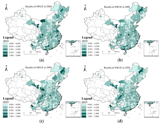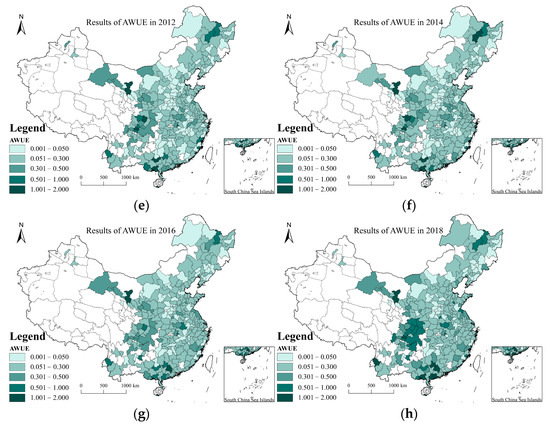 Evaluation results of AWUE. Note: Only the results of even years are shown in this figure. (a) Results of AWUE in 2004; (b) Results of AWUE in 2006; (c) Results of AWUE in 2008; (d) Results of AWUE in 2010; (e) Results of AWUE in 2012; (f) Results of AWUE in 2014; (g) Results of AWUE in 2016; (h) Results of AWUE in 2018.
