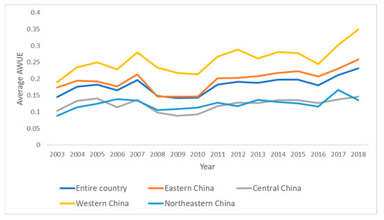 Average values of AWUE in large-scale regions of China between 2003 and 2018.